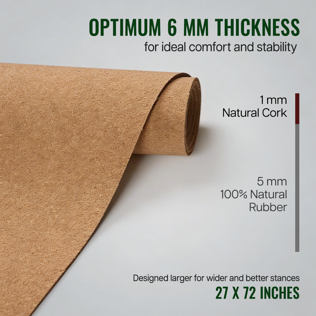 - PREMIUM CORK AND NATURAL RUBBER MATERIAL: The top layer is made from naturally sourced, high-quality & premium Cork, this mat provides a natural and comfortable surface for your yoga and fitness practice. The 100% natural rubber base delivers exceptional grip and traction. The material is free from harmful chemicals, ensuring a healthier experience for both you and the environment
