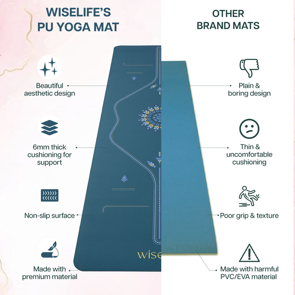 - PREMIUM PU & NATURAL RUBBER : The top layer of the mat is made from a high-quality PU which offers exceptional comfort, balance, and a luxurious feel. The 100% natural rubber base provides professional grip and stability, ensuring your mat stays securely in place during every pose