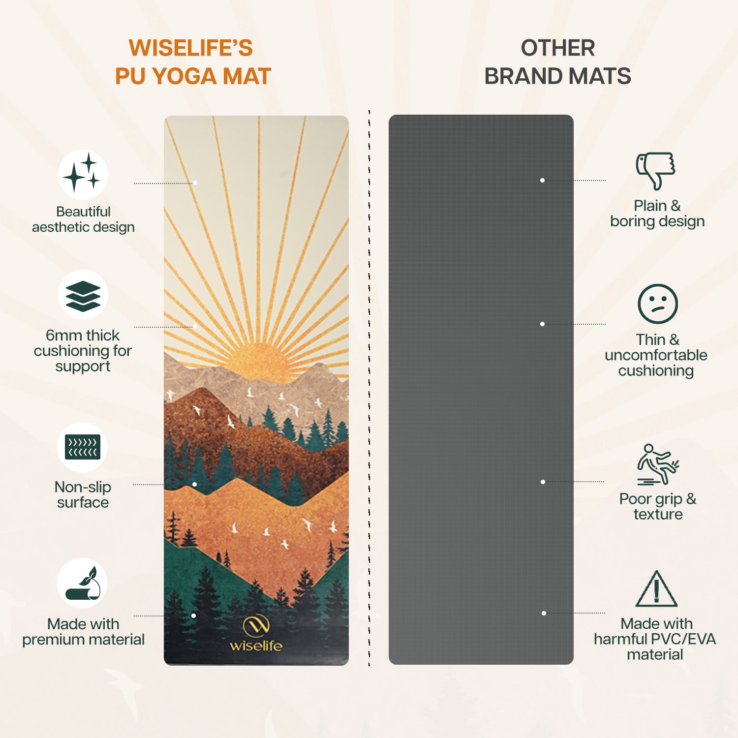 - PREMIUM PU & NATURAL RUBBER : The top layer of the mat is made from a high-quality PU which offers exceptional comfort, balance, and a luxurious feel. The 100% natural rubber base provides professional grip and stability, ensuring your mat stays securely in place during every pose