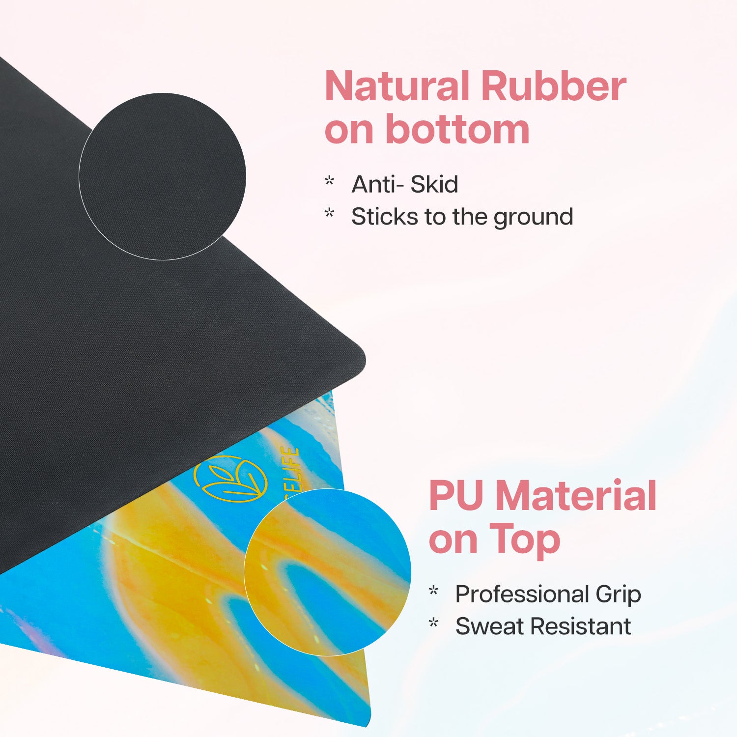 - PREMIUM PU & NATURAL RUBBER : The top layer of the mat is made from a high-quality PU which offers exceptional comfort, balance, and a luxurious feel. The 100% natural rubber base provides professional grip and stability, ensuring your mat stays securely in place during every pose
