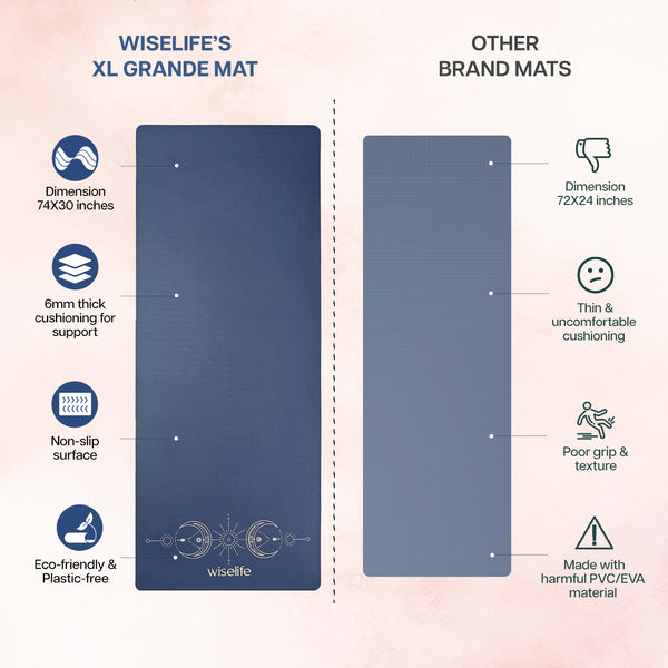 - EXTRA WIDE AND LONG : The Grand XL Yoga Mat measures 74 inches in length and 30 inches in width, offering extended space for full-body movement and enhanced comfort. Designed for those who need more room to stretch, flow, and move freely, this mat provides extra length and extra width, ensuring stability during intense poses and workouts