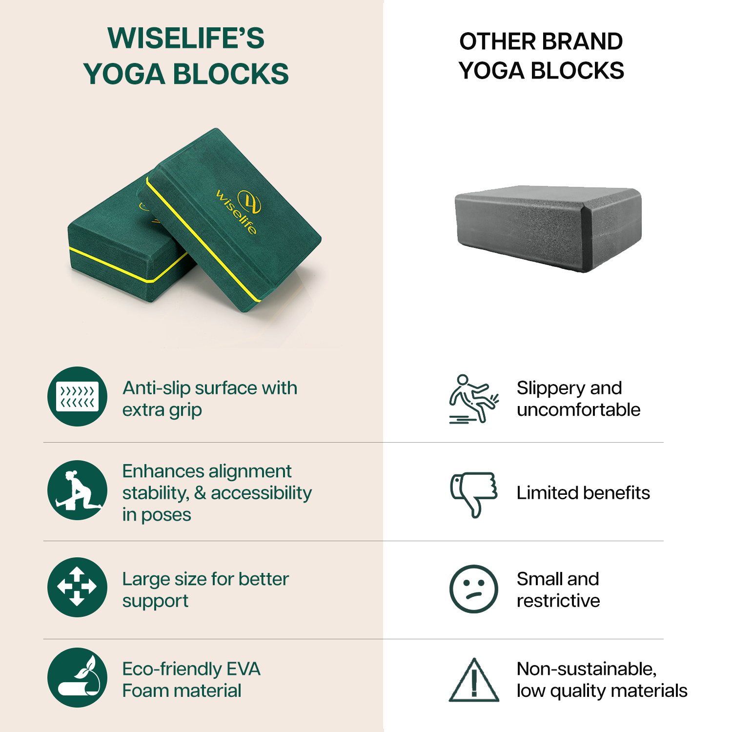 - ULTRA DURABLE & LIGHTWEIGHT: Designed for convenience, these lightweight pro yoga blocks are easy to carry, stack, and store. Their compact and travel-friendly build makes them the perfect addition to your yoga bag or gym gear. Whether you’re practicing at home, in the studio, or on the road, the Wiselife Pro Yoga Blocks offer consistent support and stability wherever your journey takes you